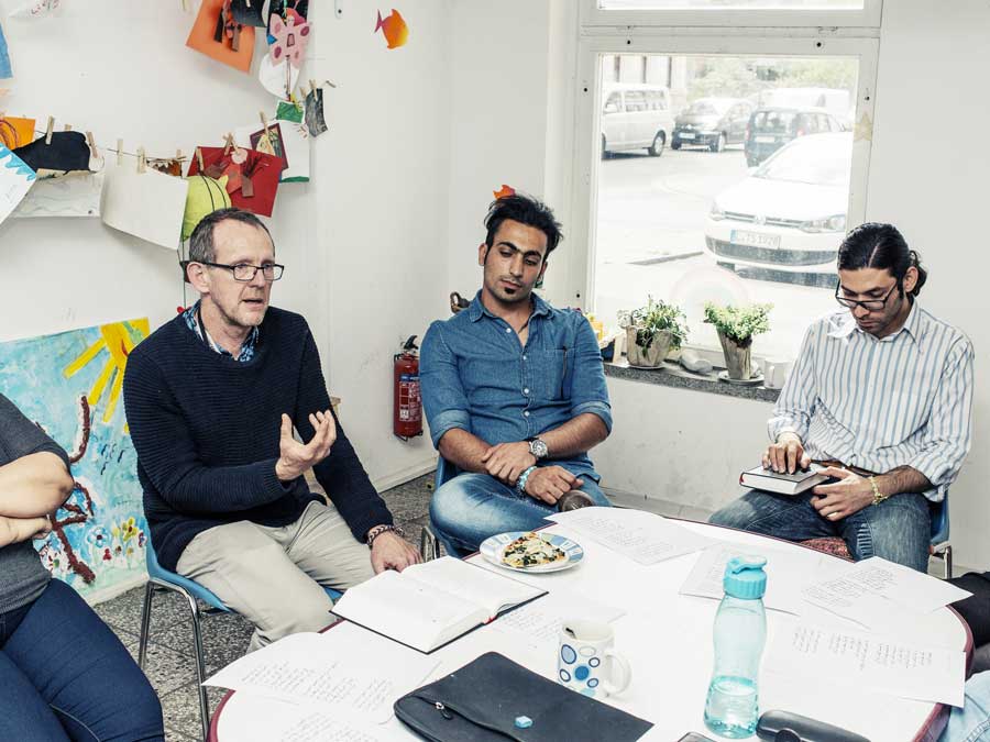 Hugo Gevers springt von Sprache zu Sprache. Ein Satz auf Deutsch, einer auf Englisch und dann spricht er auf Farsi weiter. Seit sieben Jahren arbeitet er hier in der Brücke, durch seine Arbeit mit den Iranern hat er Farsi gelernt. Dennoch übersetzt eine 40-jährige Iranerin namens Maria den Bibelunterricht, um Missverständnisse zu vermeiden.